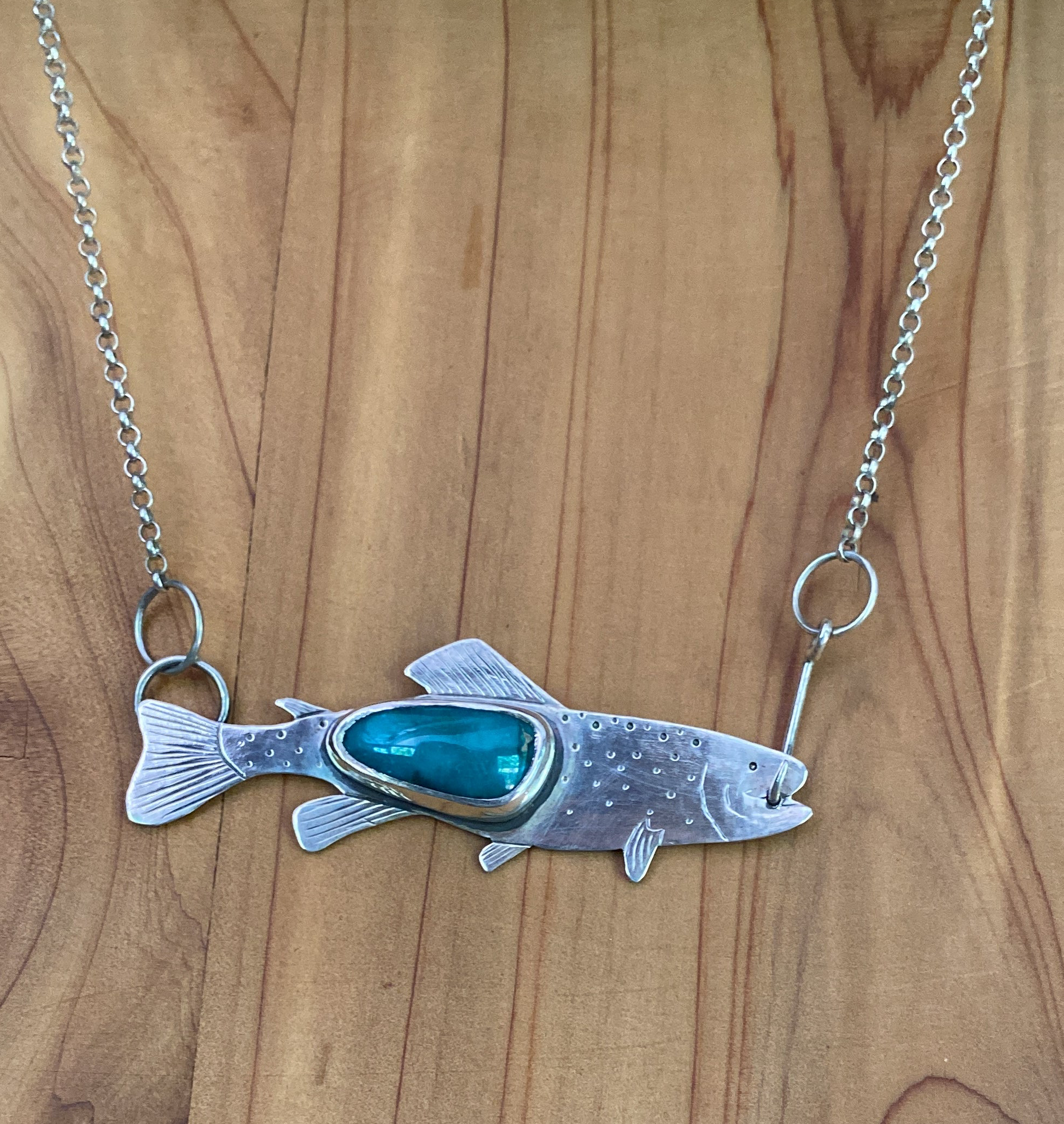 One of a kind sterling silver trout and high grade Lone Mountain Turquoise from Nevada, USA. Hand fabricated metal art by me including a trout with a hook in the mouth. Solid sterling silver chain and pendant. Chain is 18 inches.