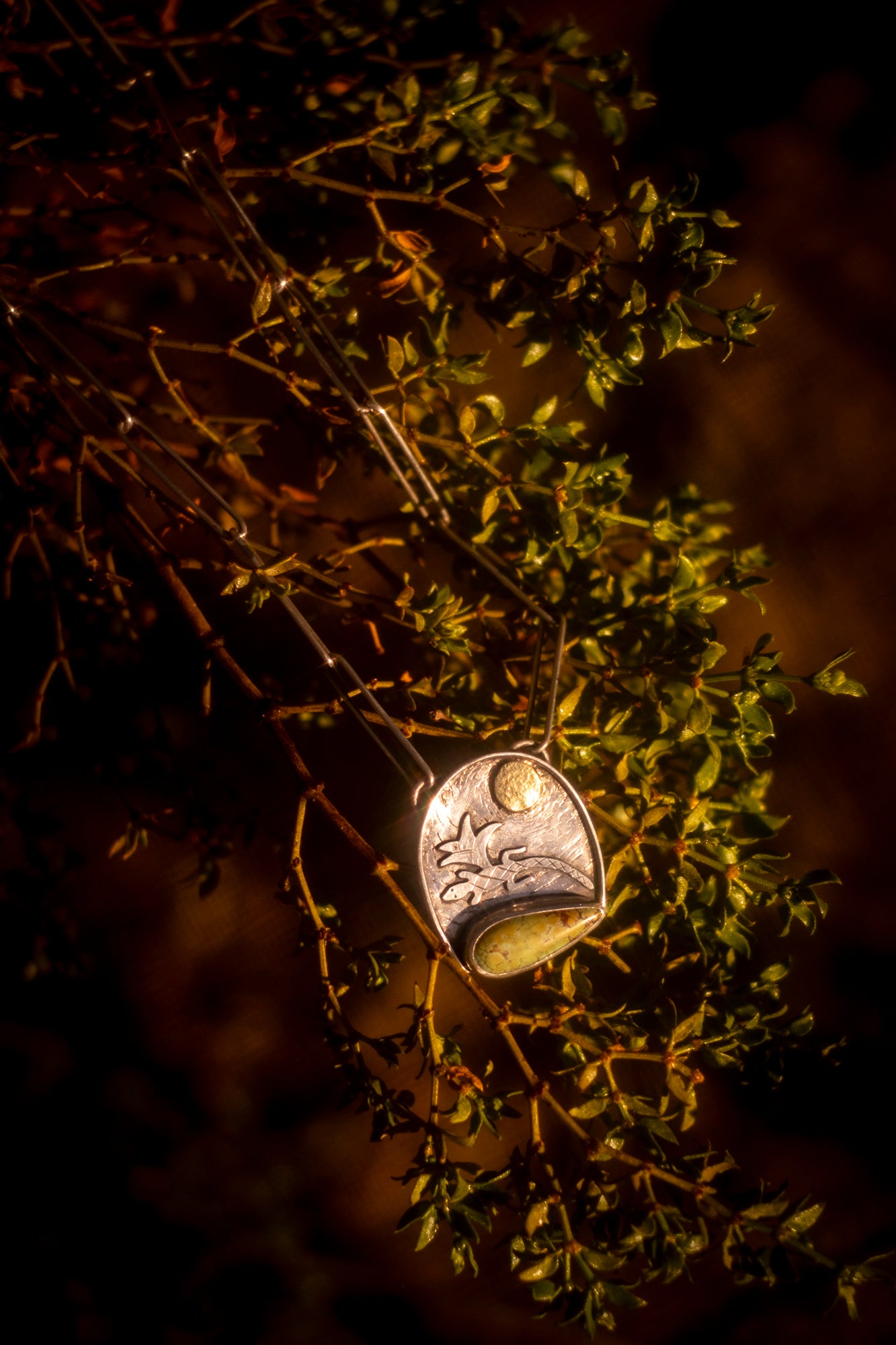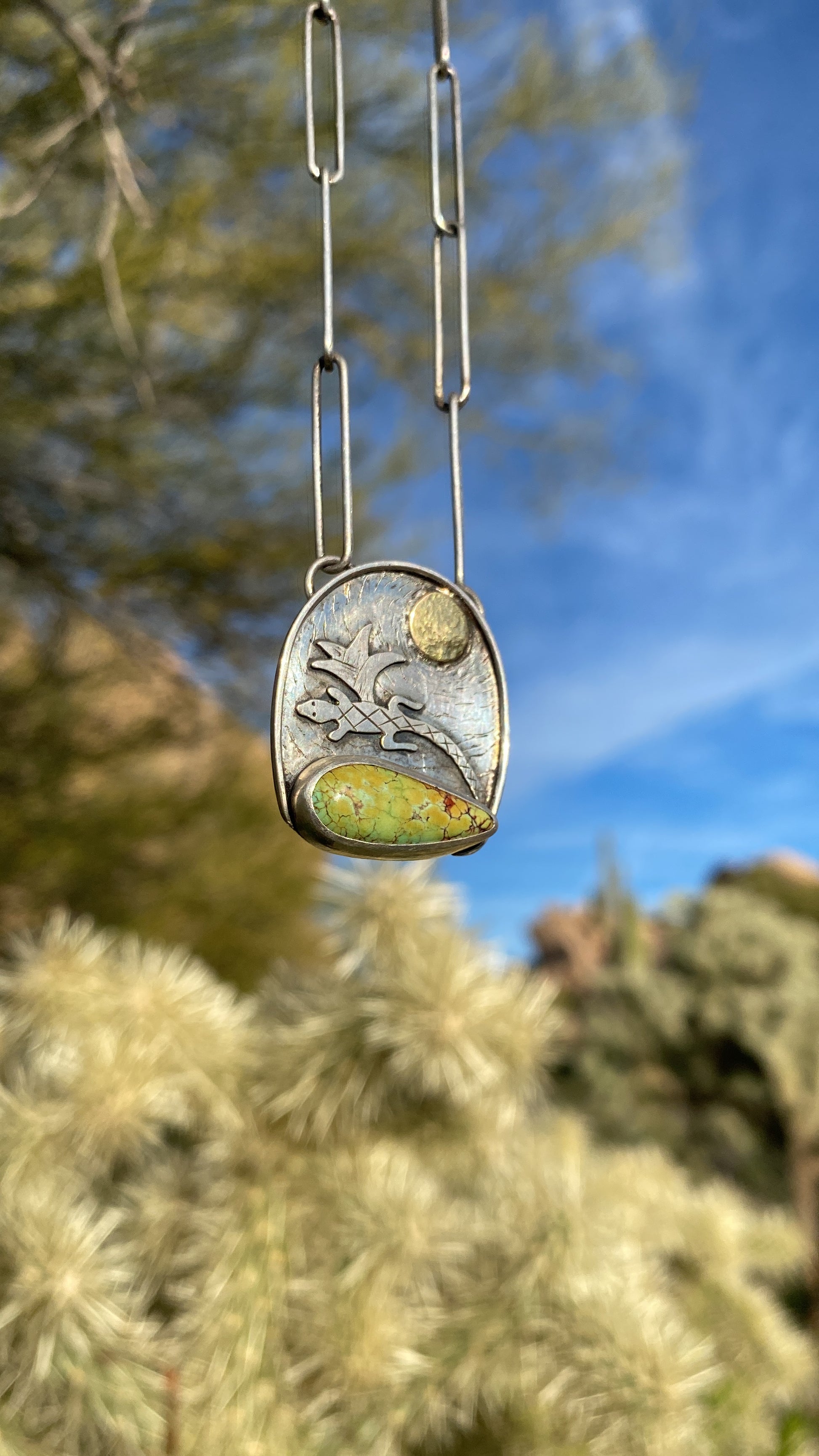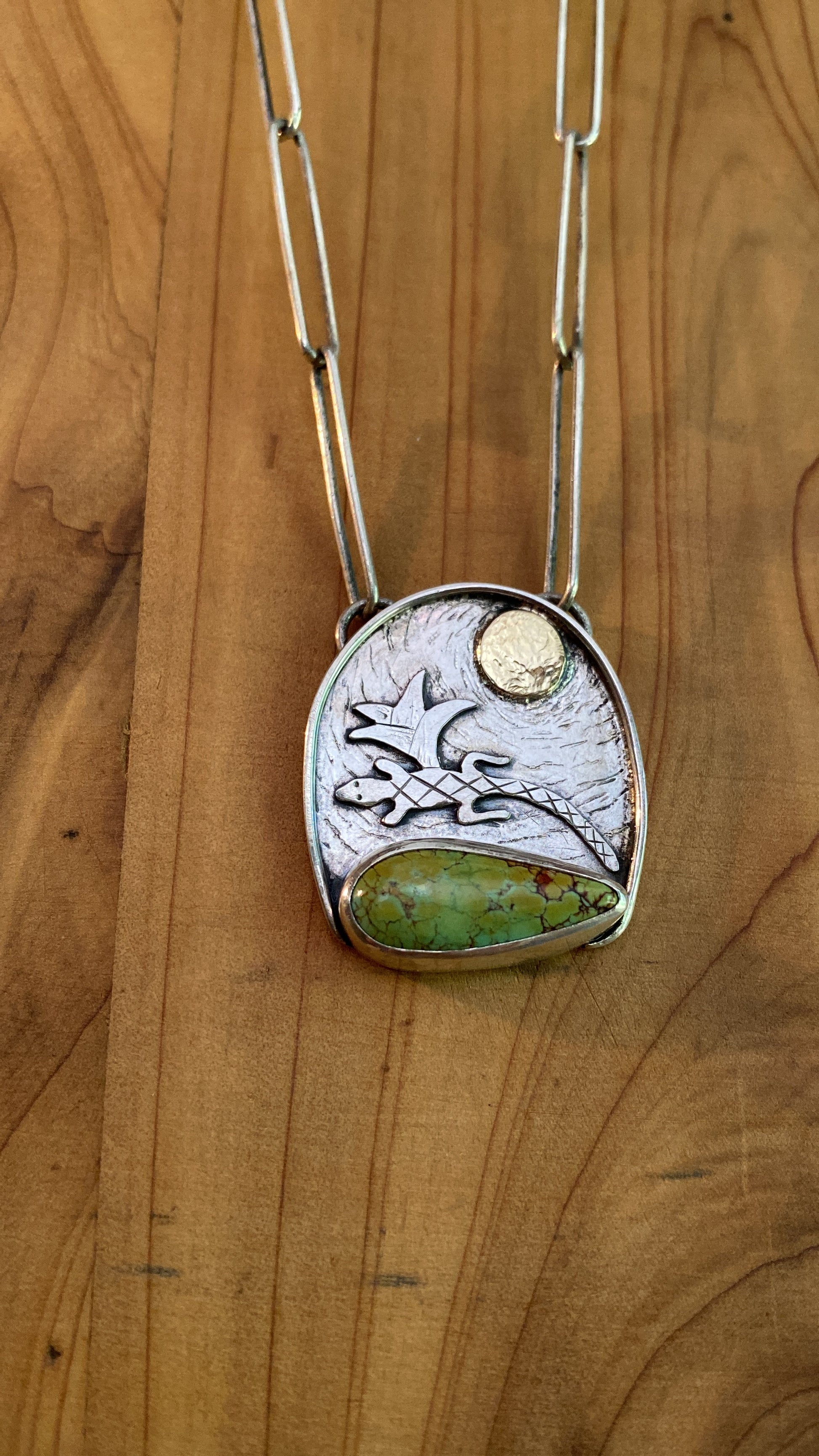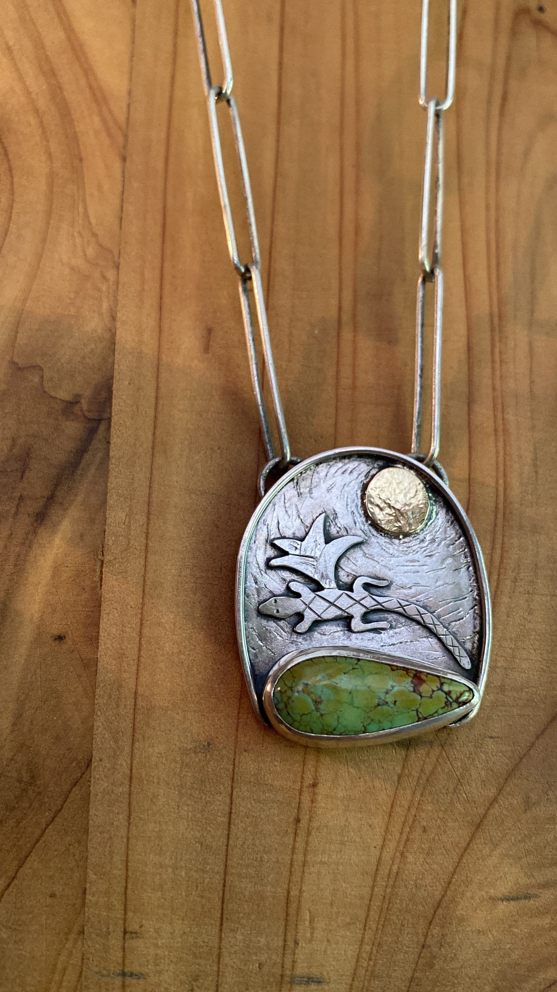 Sometimes the stone picks the design. This Blackjack Turquoise mined in Nevada shouted lizard to me. After playing around with a couple designs, I settled on this desert and lizard inspired piece. Sterling silver and 14k gold. Hand sawn, soldered, hand engraved and hammered texture. Made by me of coarse. About 1.5inch x 1inch pendant and an 18” inch sterling silver paper clip chain.