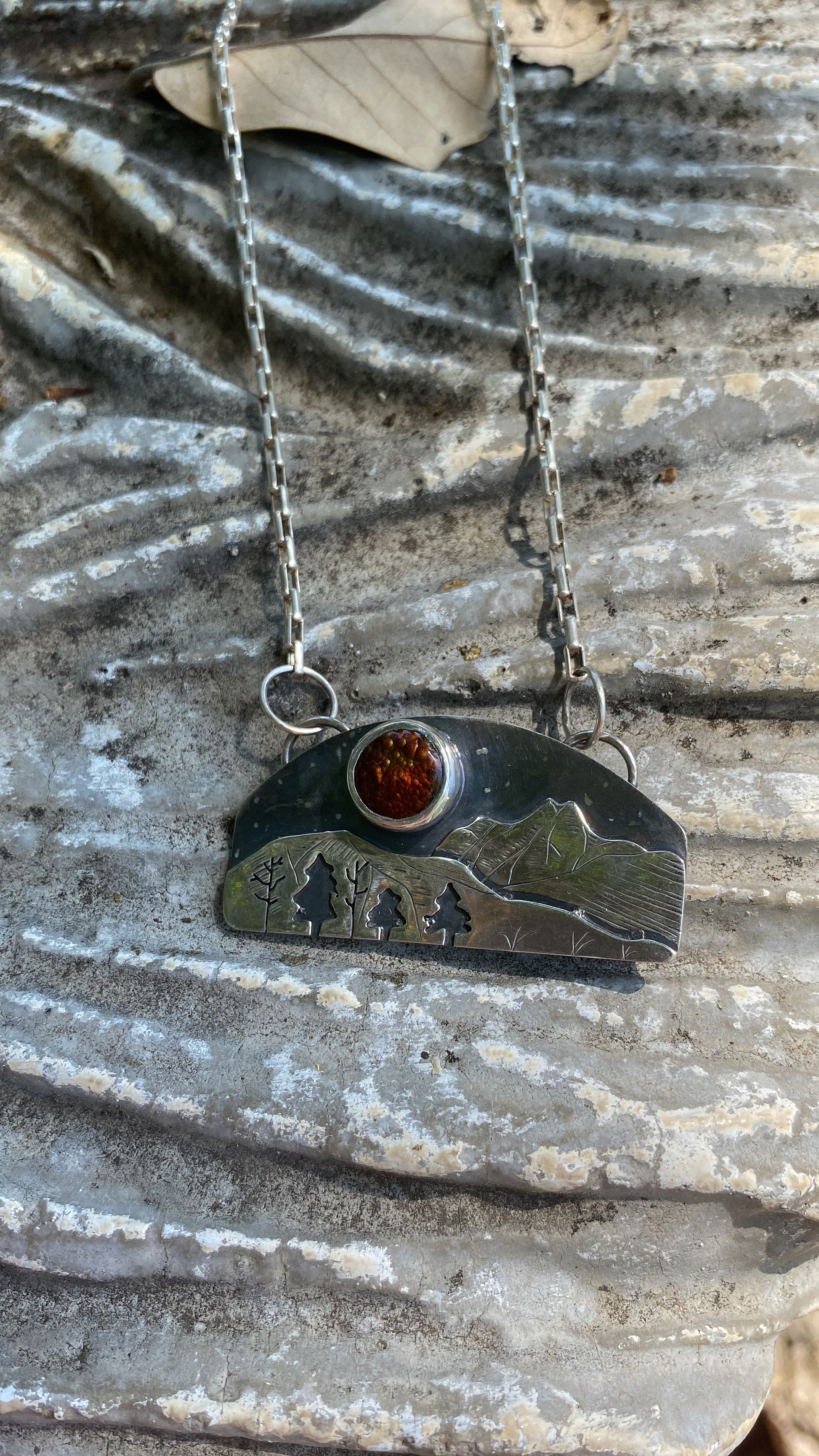 Hand crafted sterling silver mountain scene. With Mexican fire agate and 18 inch sterling silver chain. One of a kind.